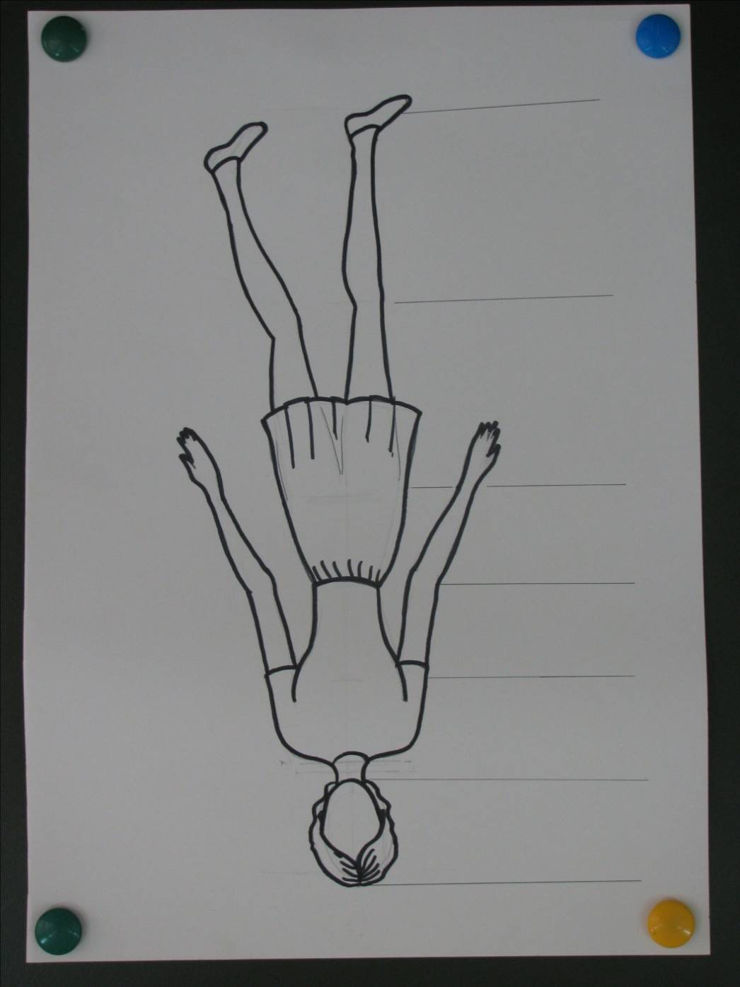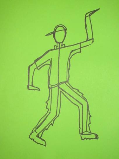 Эти же пропорции сохраняются и в движении, если мы сгибаем ногу или поднимаем руку. Проверяем, правильно ли мы учли пропорции в схеме, равны ли руки и ноги друг другу. Дальше прорисовываем, фигуру человека учитывая пропорции, изображаем торс, талию, бёдра, руки и ноги. В последнюю очередь рисуем одежду. Обращаем внимание именно на контур рисунка, не прорисовываем детали внутри фигуры. Законченный рисунок закрашиваем чёрным маркером и вырезаем.