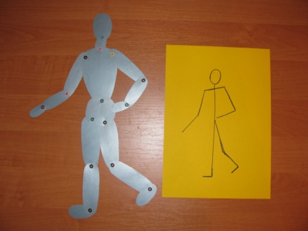 Большую помощь в освоении данной темы может оказать работа с плоскими подвижными моделями фигуры человека (изготовленные из картона силуэты фигуры человека в фас и в профиль с подвижным креплением частей).