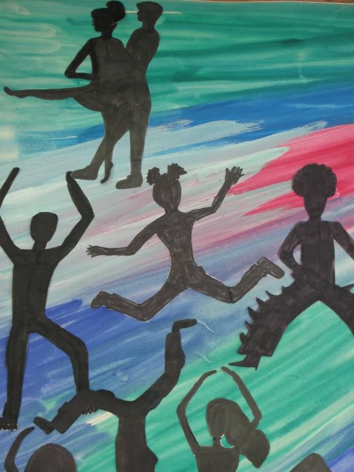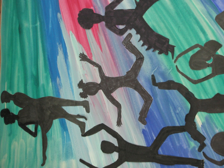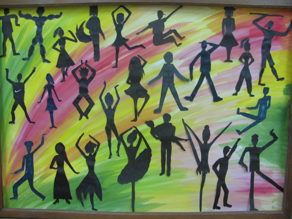 Чтобы учащихся ничего не отвлекало от главного, а именно от передачи движения в рисунке, я предлагаю задание, где движущейся человек изображён с помощью силуэта. Это позволяет детям, сосредоточится только на выполнении поставленной перед ними задачи и уложится в рамки одного урока. Это творческое задание позволяющее детям проявить себя, создавая смешной или лиричный образ. Создание коллективной композиции в конце урока повышает самооценку каждого ребёнка.