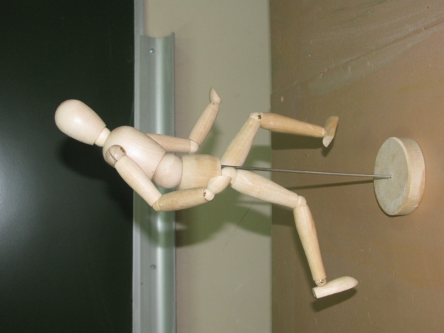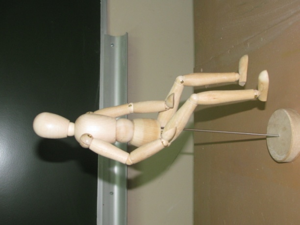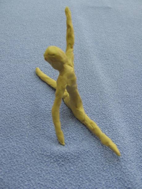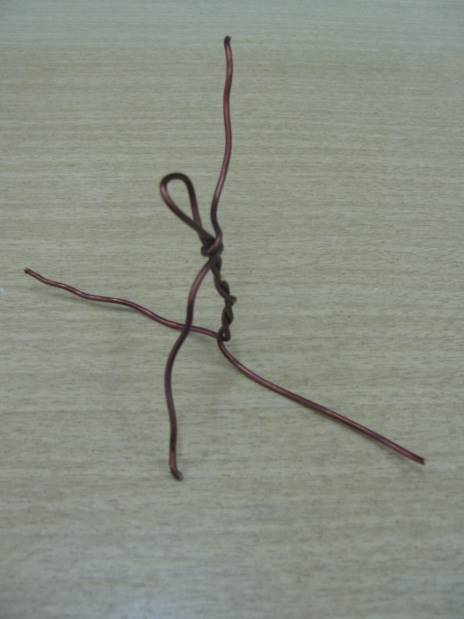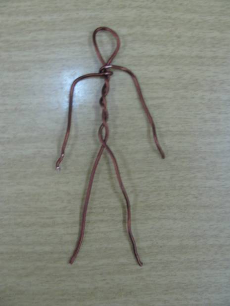 Сгибаем проволоку в коленях это середина длины ног. Сгибаем в локтях это середина длины рук. Изгибаем в позвоночнике, так, чтобы получилось задуманное движение. Можно создать несколько вариантов движения и выбрать лучший вариант. Медленно поворачивая каркас вокруг своей оси, проверяем, не получилась ли фигурка плоской с какой либо точки зрения (фигура должна быть объёмной со всех сторон). Закрепляем каркас на подставке.