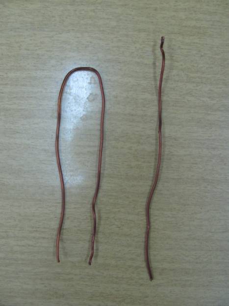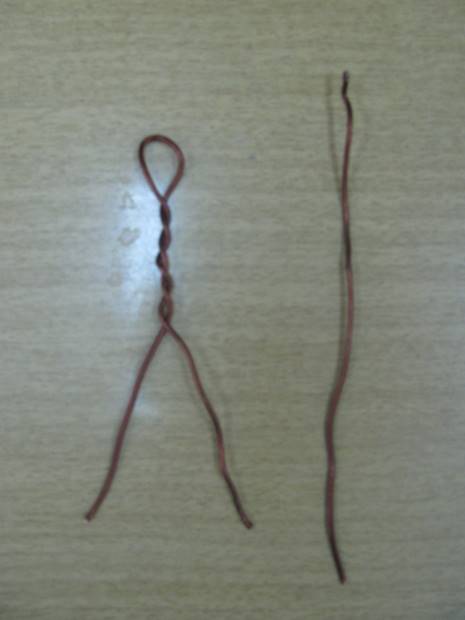 Складываем кусок проволоки пополам, оставляя петлю, скручиваем проволоку до середины всей высоты каркаса, оставшаяся не скрученной проволока будет каркасом для ног. Проверяем, дотягивается ли нога по своей длине до затылка, сгибая проволоку.